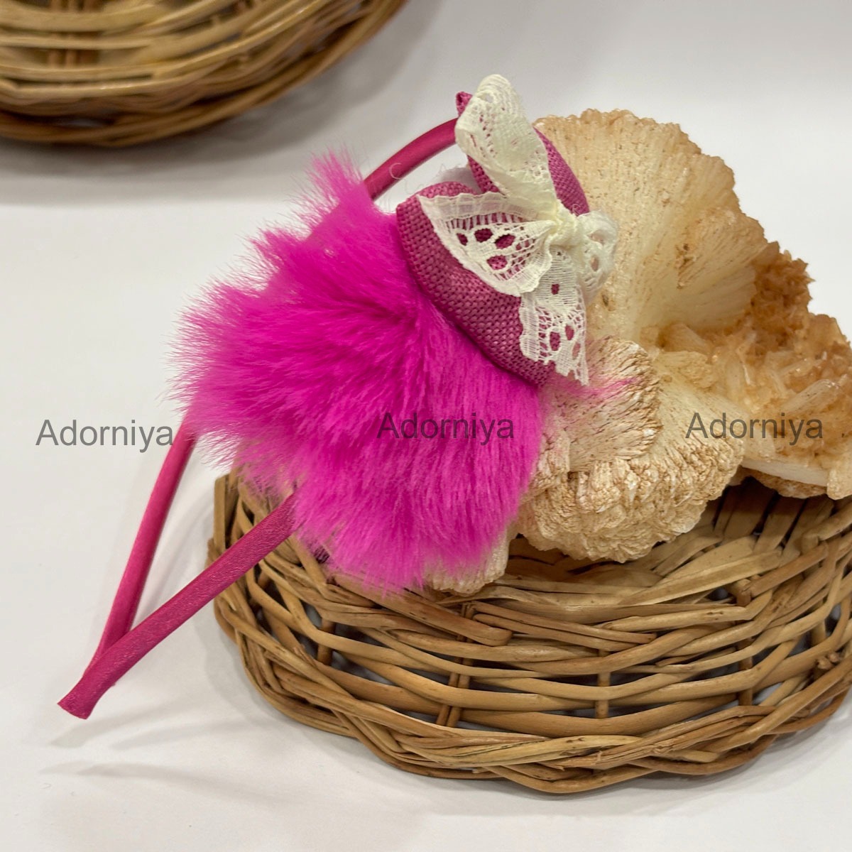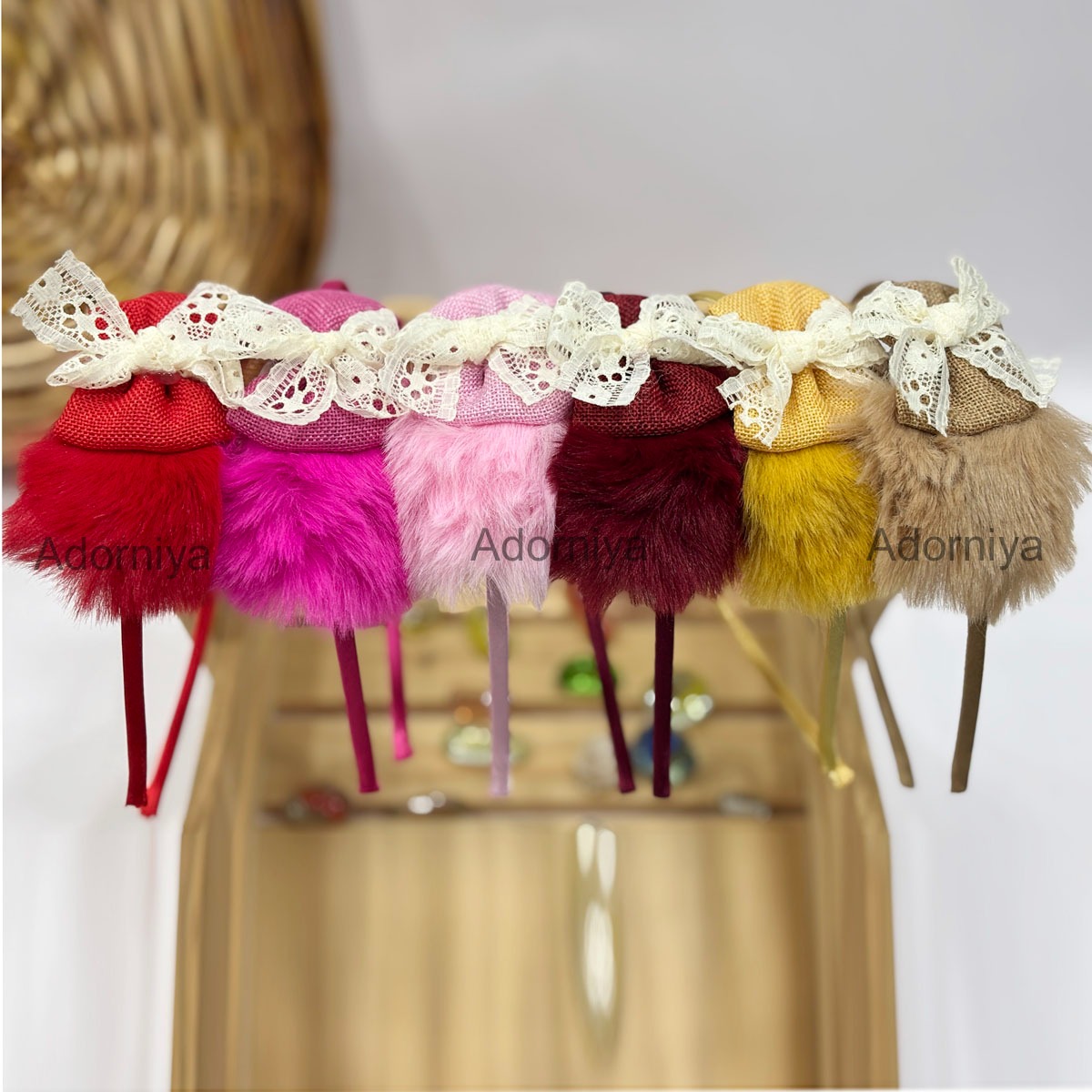 These headbands , each decorated with a faux fur puff, a fabric base, and a cream lace bow. The headbands are displayed in a gradient of rich and pastel shades.