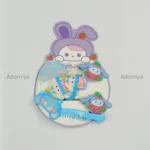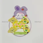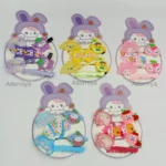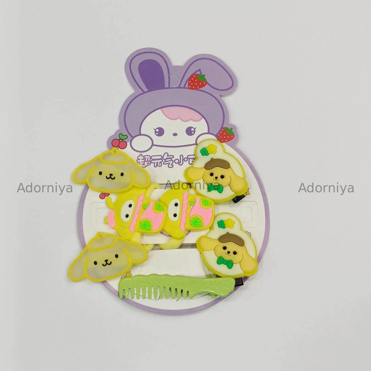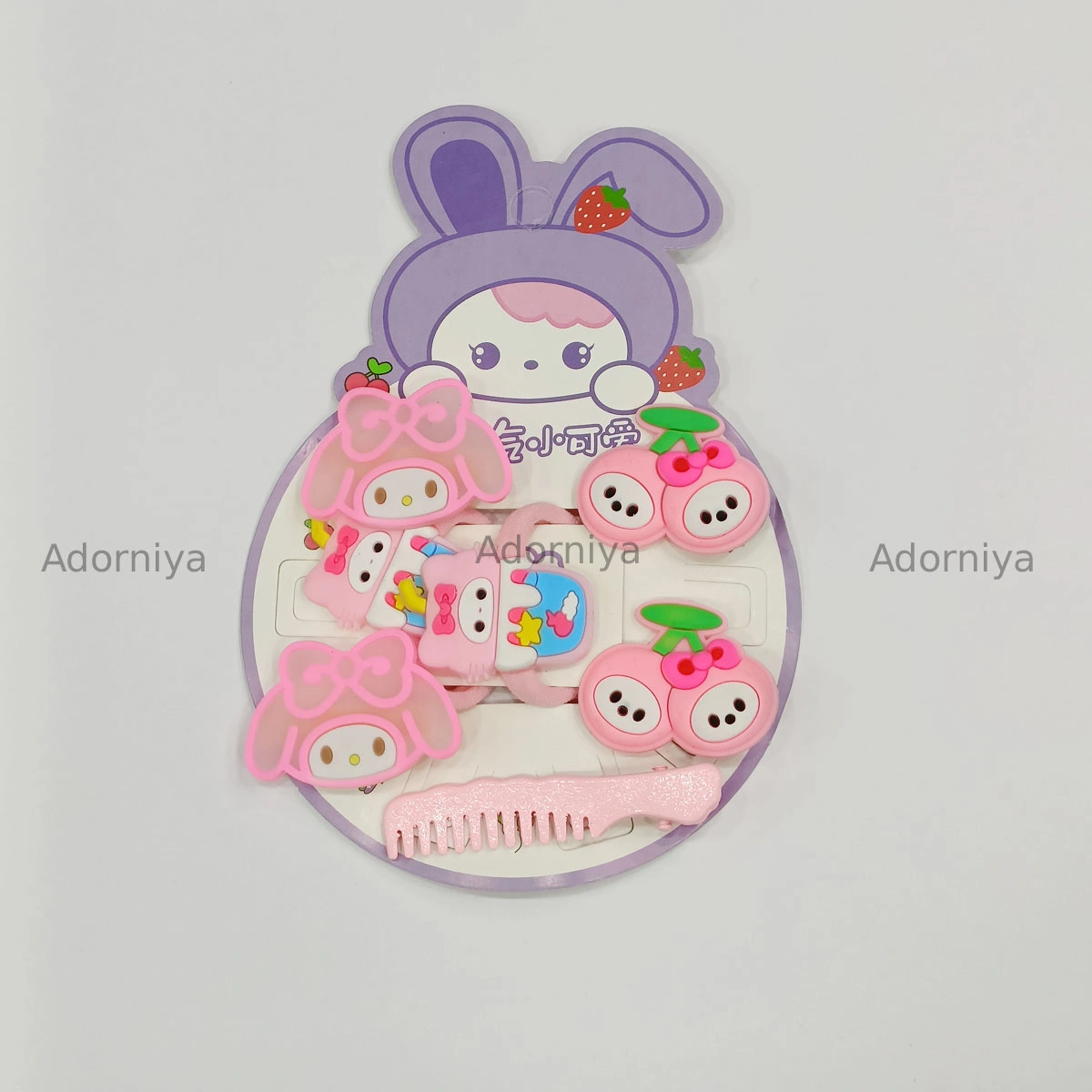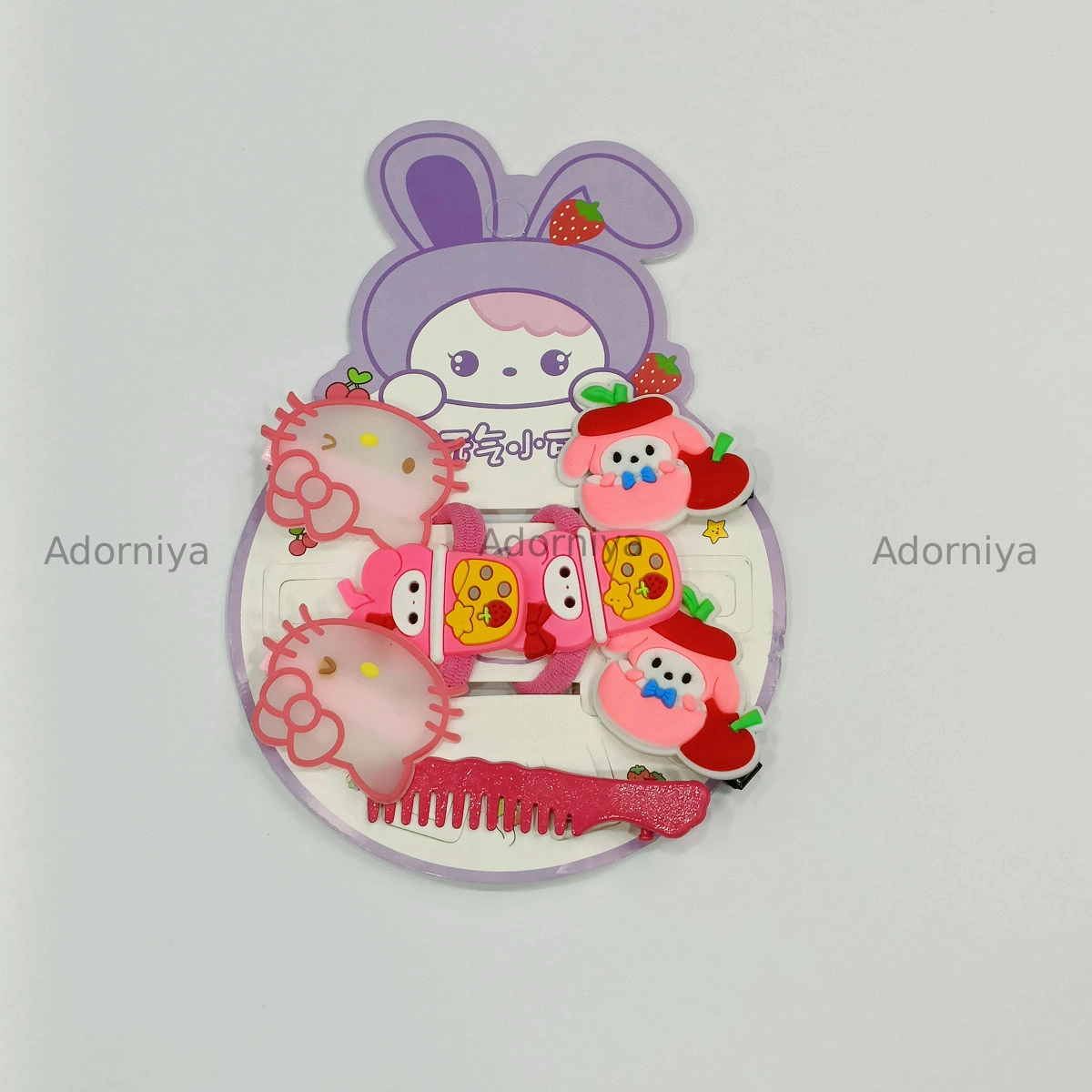 A set of adorable hair accessories The card features a cartoon bunny character with strawberry details. The accessories include hair clips with Hello Kitty-like designs and cute dog motifs with apples and bows. There are also hair ties and a small pink comb included in the set.