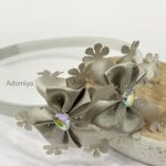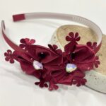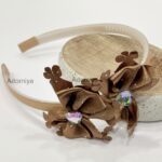 - This sophisticated headband features rich brown satin flowers accented with delicate floral cutouts and sparkling iridescent crystal gems. A graceful accessory ideal for festive occasions, weddings, or elevating everyday wear with a touch of charm.