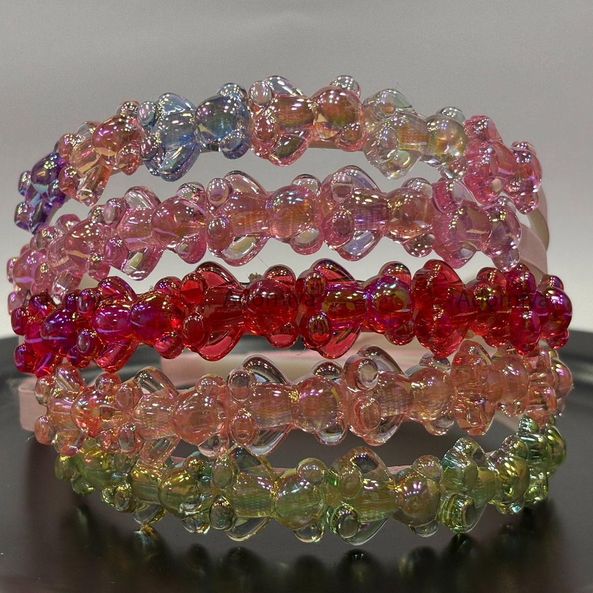 This elegant headband features a cluster of iridescent beads arranged in a floral-like pattern on a soft pink band. A charming accessory that adds sparkle and a touch of glamour to any hairstyle, perfect for parties or special occasions.